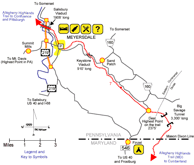 This page is part of the Allegheny Trail Alliance's site in support of the Great Allegheny Passage, a motor-free recreational rail trail connecting Pittsburgh PA and Cumberland MD. Copyright © 1998, 1999, 2000, 2001by Allegheny Trail Alliance, Bill Metzger, Mary Shaw, and Roy Weil. Amenity information courtesy of FreeWheeling Easy. We encourage you to create links to this site and to print copies of the maps for your personal use. We prohibit other uses of this site, especially if they generate spam or other mass communications -- see our Privacy Policy.. This page was last modified on 07/09/01. Send email to ATA or contact the ATA or member trails.