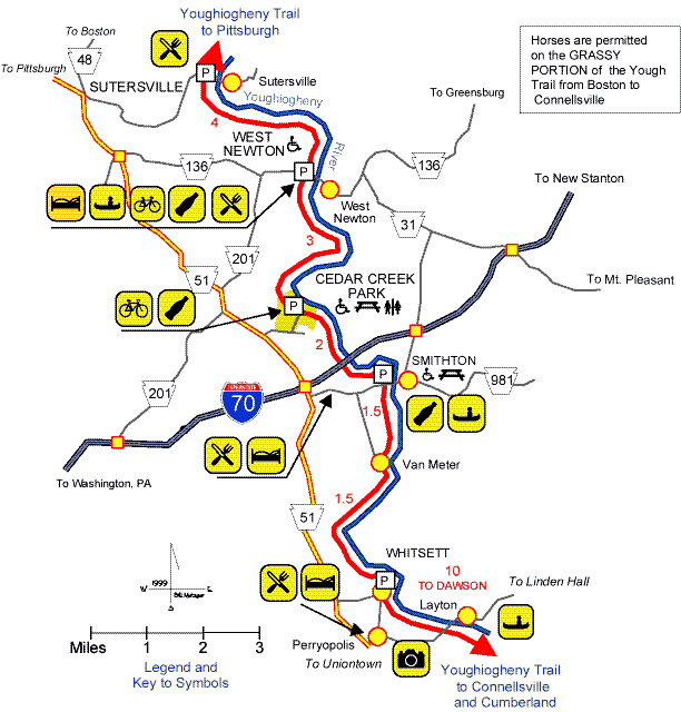 | This page is part of the Allegheny Trail Alliance's site in support of the Great Allegheny Passage, a motor-free recreational rail trail connecting Pittsburgh PA and Cumberland MD. Copyright © 1998, 1999, 2000, 2001by Allegheny Trail Alliance, Bill Metzger, Mary Shaw, and Roy Weil. Amenity information courtesy of FreeWheeling Easy. We encourage you to create links to this site and to print copies of the maps for your personal use. We prohibit other uses of this site, especially if they generate spam or other mass communications -- see our Privacy Policy.. This page was last modified on 12/29/01. Send email to ATA or contact the ATA or member trails. | ||||||