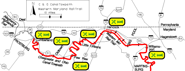 At Cumberland, the Allegheny Trail Alliance system connects with the C&O Canal Towpath. The official web site for the towpath is at the National Park Service. Four good complementary sites are the Potomac Conservancy, the C&O Canal Association, Kathy Bilton's Canal pages, and a biking guide at Urban ATB. The paved Western Maryland Rail-Trail now parallels the towpath for 10 miles from Hancock to Big Pool Maryland.