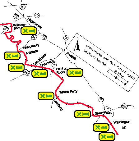 The FreeWheeling Easy database of trailside amenities, which supplies information to the maps on this site, extends onward from Cumberland down the C&O Canal to Washington DC. For the convenience of through-travelers, we provide that information here. Click on the generic amenity symbol for all information about the corresponding location. See the sites mentioned above for other information.