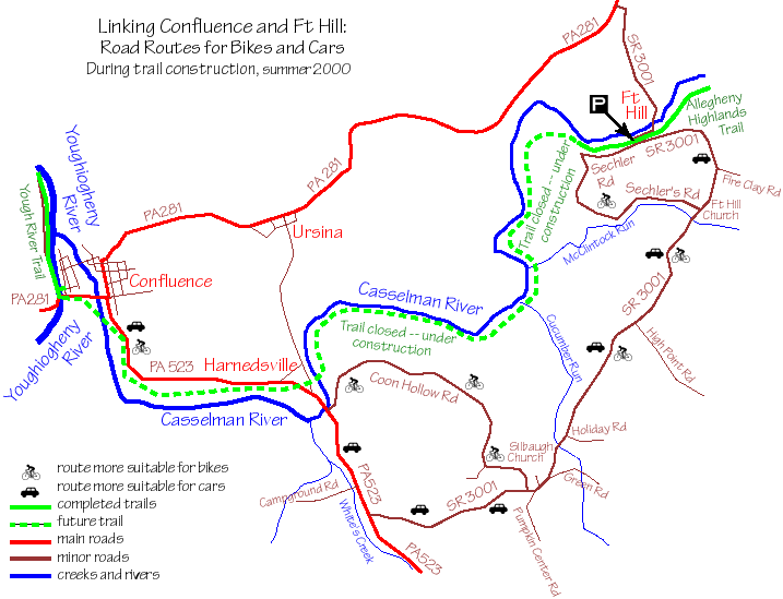 The Allegheny Highlands Trail between Ft Hill and Confluence will be under construction during the fall and winter of 2000. If you want a long ride connecting the Allegheny Highlands Trail to the Yough River Trail South, you'll have to detour between Ft Hill and Confluence. In addition, you may want to drive between Ft Hill and Confluence on the east side of the Casselman River instead of the usual and obvious route via PA281 on the west side of the river. Here are a map and cue sheets for this route. We road-checked these directions on May 13, 2000.