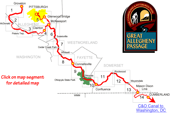 | This page is part of the Allegheny Trail Alliance's site in support of the Great Allegheny Passage, a motor-free recreational rail trail connecting Pittsburgh PA and Cumberland MD. Copyright © 1998, 1999, 2000, 2001by Allegheny Trail Alliance, Bill Metzger, Mary Shaw, and Roy Weil. Amenity information courtesy of FreeWheeling Easy. We encourage you to create links to this site and to print copies of the maps for your personal use. We prohibit other uses of this site, especially if they generate spam or other mass communications -- see our Privacy Policy.. This page was last modified on 12/04/03. Send email to ATA or contact the ATA or member trails. | ||||||